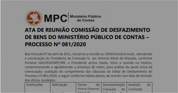 O Ministério Público de Contas de Roraima (MPC/RR) torna pública a Ata com a relação das instituições que cumpriram os termos do processo de Desfazimento de Bens Móveis do MPC/RR nº 081/2020.