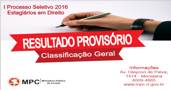 Na manh de quinta-feira, 05, o Ministrio Pblico de Contas torna pblico o Resultado Provisrio e a Classificao Geral do I Processo seletivo para preenchimento de vagas para estgio na rea de direito.