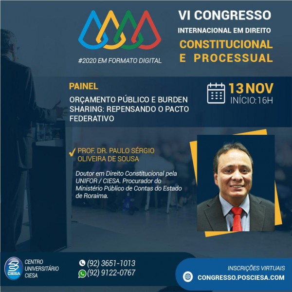 O procurador do Ministério Público de Contas de Roraima (MPCRR), Paulo Sérgio Oliveira de Sousa, irá participar como palestrante no VI Congresso Internacional em Direito Constitucional e Processual. O evento será promovido pelo Centro Universitário Ciesa, na próxima sexta-feira (13/11), às 15h (horário de Boa Vista), por meio de plataforma digital.